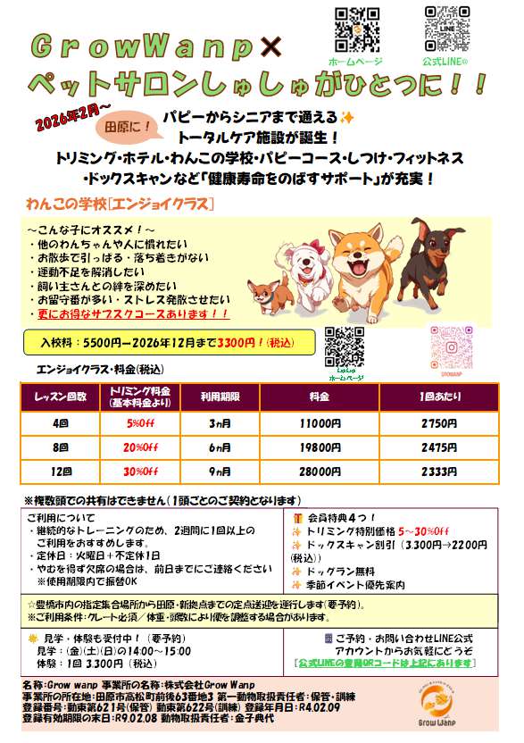 このたび、事業体制の見直しに伴い、豊橋で運営してまいりました「GrowWanp」は、田原の「ペットサロンしゅしゅ」へ拠点を統合することとなりました。
